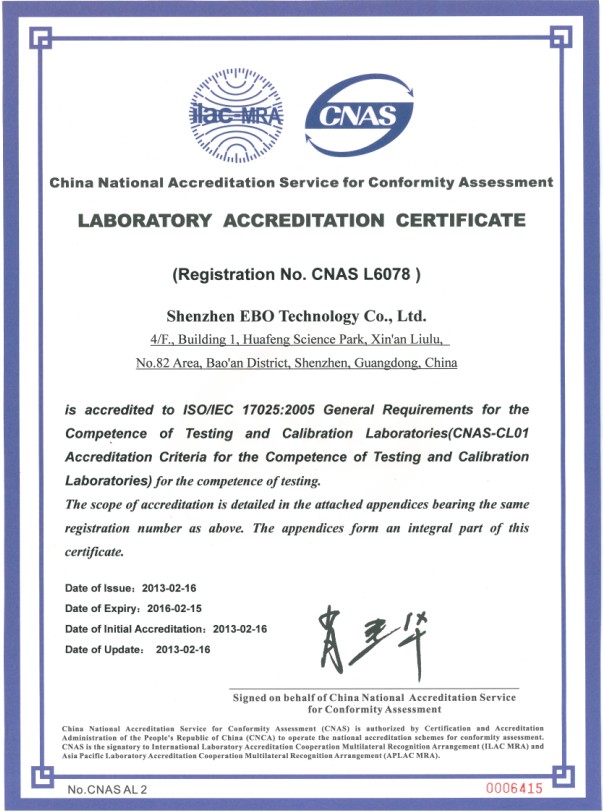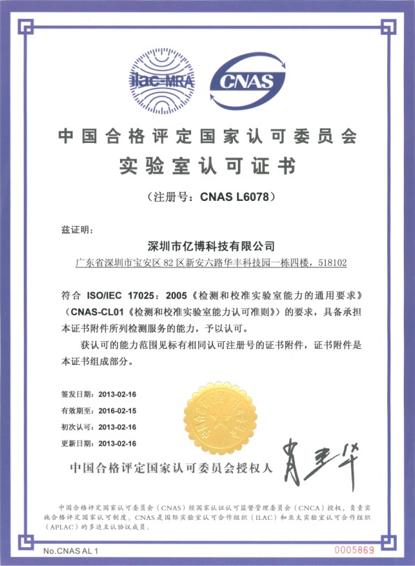 2012年12月,亿博检测中心顺利通过中国合格评定国家认可委员会(CNAS)组织的现场评审,并在2013年2月正式取得CNAS认可证书,证书编号CNAS L6078。这标志着亿博检测实验室获得国家权威机构的认可,赢得了国内、国际实验室认可机构的信任,极大的提升了我司产品的市场竞争能力。